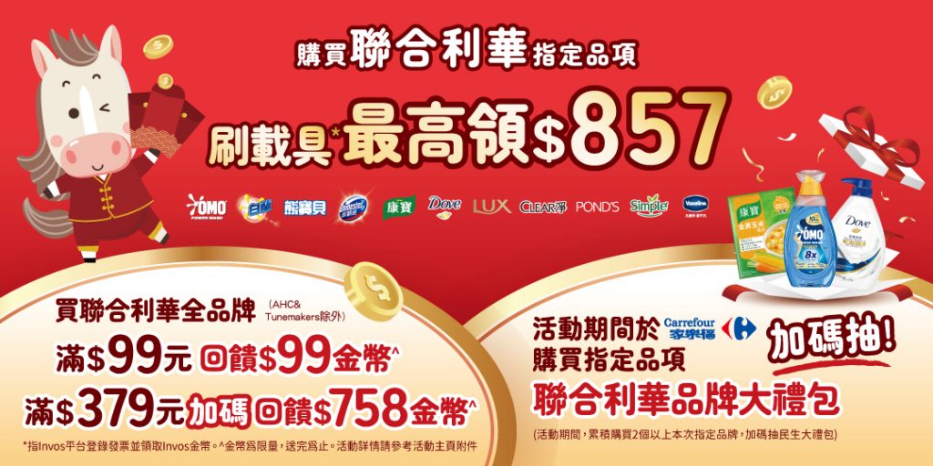 - 抽獎資格:活動期間,於家樂福累積購買 2 個以上聯合利華指定品牌,加碼抽『聯合利華民生大禮包』10名(可重複中獎)