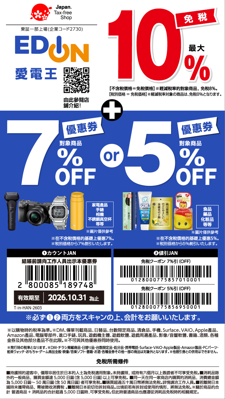 - 本優惠券僅適用於日本 EDION 愛電王免稅店鋪。