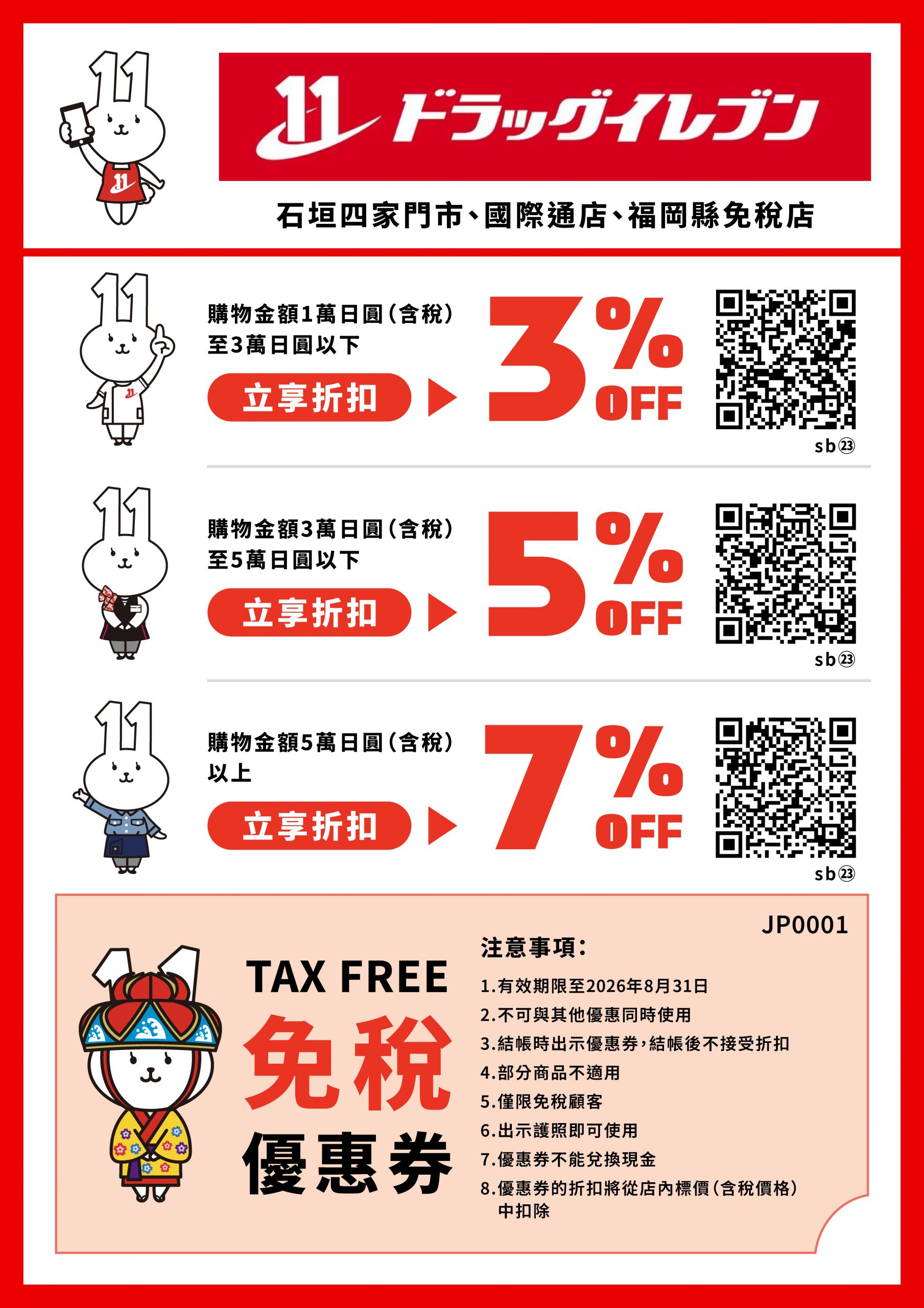 - 本優惠券適用於 Drug Eleven(石垣四家門市、國際通店、福岡縣免稅店)。