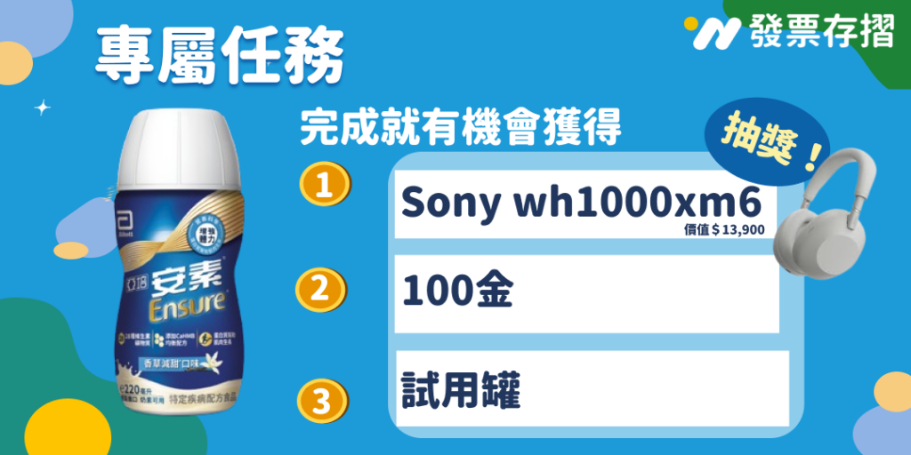 - 驚喜加碼-SONY WH-1000XM6 耳罩式耳機:2025/06/01 ~ 2025/07/31 透過發票存摺 APP 任務區完成此任務,經審核符合資格者,即享有抽獎資格。中獎名單(2025/08/10 抽出,已發送中獎通知信至得獎人電子信箱,請於信件內提及之時間內回覆,未於時間內回覆將失去領獎資格)